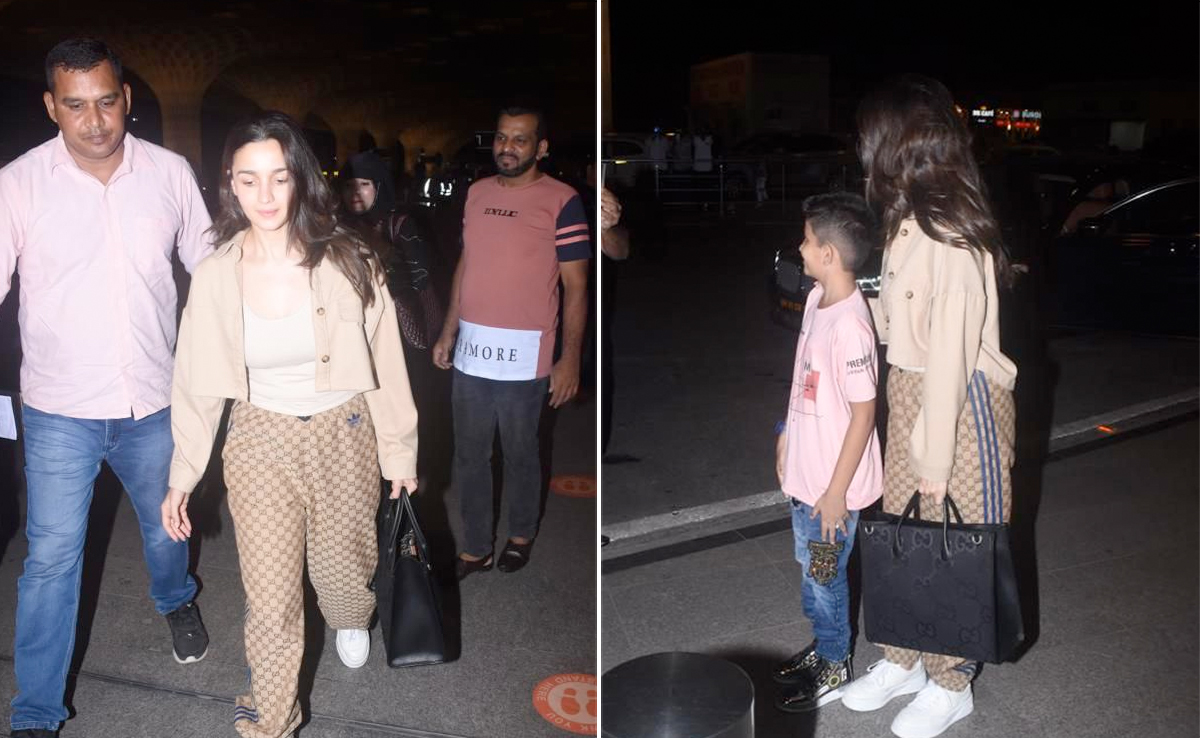 Alia Bhatt was clicked at the Mumbai airport last night as she flew out of the city, presumably to attend the upcoming Met Gala in New York. The actress, whose airport fashion comprised of a brown jacket and pants, was spotted stepping out of her car and making her way inside the airport. As the Darlings star walked on, followed by the paparazzi, she was intercepted by some of her youngest fans for some pictures. Alia Bhatt was seen obliging as she posed with a little boy while greeting her other fans with a wide smile.
