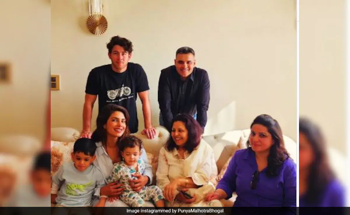 Priyanka Chopra had an eventful India trip recently. The Citadel actor was accompanied by husband Nick Jonas and daughter Malti Marie. Days after their departure from India, a family picture featuring Priyanka Chopra, Malti Marie and Nick Jonas was shared by Punya Malhotra Bhogal (presumably Priyanka's acquaintance) on Instagram feed. In the picture, Priyanka, Nick and Malti can be seen dressed in their casual best. Malti can be seen seated on her mother's lap. The picture features Punya Malhotra Bhogal and her family members as well. Sharing the picture, Punya Malhotra Bhogal wrote, "Sometime last week with our cute lil bunny Malti." Take a look: