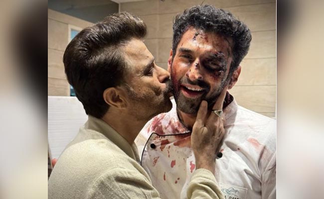 Anil Kapoor is super excited about his upcoming web series - The Night Manager. The web series is directed by National Award-winning director Sandeep Modi. Now, the veteran actor has shared a behind-the-scenes moment from the sets of the show, which is a Hindi remake of the British spy series, which starred Tom Hiddleston, Huge Laurie, Elizabeth Debicki and Olivia Colman. Here, Anil Kapoor is planting a kiss on Aditya Roy Kapur's cheeks. Aditya looks rough with bruises and blood. For the caption, Anil Kapoor wrote, “What can I say...I like them bloody.” Replying to the post, Sobhita Dhulipala, who is also part of the series, wrote, “Lol…This was the day you looked your best, Aditya Roy Kapur.” Aditya too didn't miss and wrote, “Sirrr” with a ROFL emoji. Actress Shilpa Shetty found it really funny.