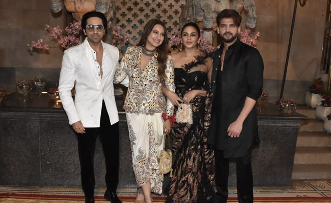 Ayushmann Khurrana looked handsome in a white blazer paired up with a matching shirt and pair of black trousers. He completed his overall looks with retro-style glares. On the other hand, Suniel Shetty and Ahan Shetty were twinning in black outfits. Raveena Tandon, Sonakshi Sinha and Huma Qureshi looked beautiful as well. Raveena opted for a traditional green saree and Sonakshi wore a fusion outfit for the reception.