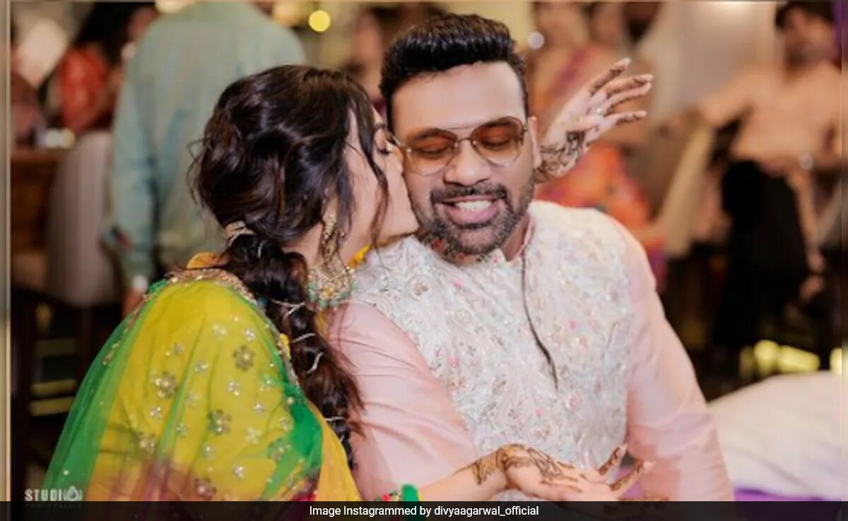 Bigg Boss OTT winner Divya Agarwal married restaurateur Apurva Padgaonkar earlier this week. Divya has now shared some fun-filled pictures from her mehendi ceremony on Instagram and she captioned it, "Pinch me, I must be dreaming! Punjab ka Pind came alive for my mehendi! Every shade, every step, every laugh - etched in henna and forever in my heart." For the festivities, Divya Agarwal wore a bright yellow outfit from the shelves of Asbaab by Madiha Farooq. Divya can be seen dancing in the pictures. We also got a glimpse of her henna design.