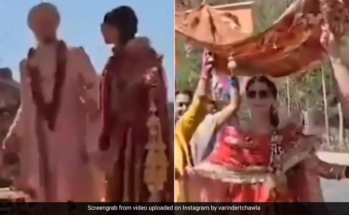 Days after Taapsee Pannu and Badminton player Mathias Boe's marriage report surfaced online, an inside video from their intimate Udaipur wedding has been trending on social media on Wednesday. In the video, Taapsee Pannu, dressed as a traditional Punjabi bride, can be seen dancing her heart out during her entry. Taapsee can be seen sporting kaleeras and choodas. As soon as she reaches the stage, groom Mathias Boe can be seen hugging her. Mathias Boe, whose face is covered with a sehera, can be seen dressed in a traditional outfit. The video also documents moments from their garlands exchange ceremony. Mathias can be seen kissing Taapsee on her cheeks. The video is already crazy viral. Take a look here: