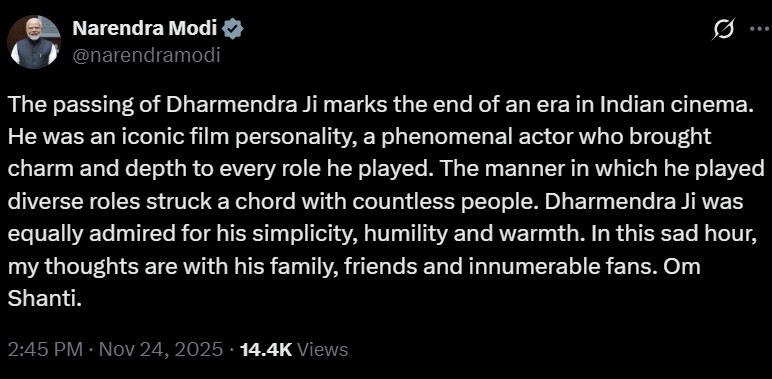 "The passing of Dharmendra Ji marks the end of an era in Indian cinema. He was an iconic film personality, a phenomenal actor who brought charm and depth to every role he played. The manner in which he played diverse roles struck a chord with countless people. Dharmendra Ji was equally admired for his simplicity, humility and warmth. In this sad hour, my thoughts are with his family, friends and innumerable fans. Om Shanti," the Prime Minister wrote.