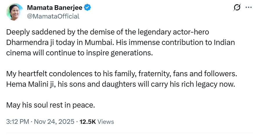 West Bengal Chief Minister Mamata Banerjee mourned the untimely death of veteran actor Dharmendra. She wrote on X, "Deeply saddened by the demise of the legendary actor-hero Dharmendra ji today in Mumbai. His immense contribution to Indian cinema will continue to inspire generations."