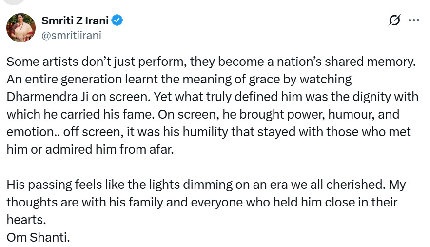Smriti Irani expressed that some artists transcend mere performance to become an icon. She wrote on X, "Some artists don’t just perform, they become a nation’s shared memory. An entire generation learnt the meaning of grace by watching Dharmendra Ji on screen. Yet what truly defined him was the dignity with which he carried his fame. On screen, he brought power, humour, and emotion.. off screen, it was his humility that stayed with those who met him or admired him from afar."
