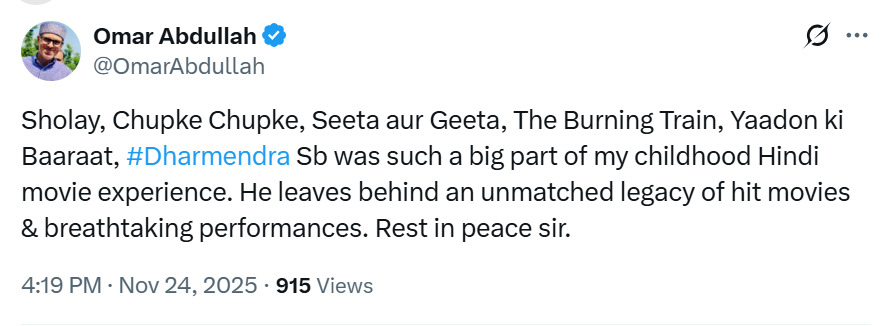 Taking to his X handle, Chief Minister of Jammu and Kashmir, Omar Abdullah, wrote, "Sholay, Chupke Chupke, Seeta aur Geeta, The Burning Train, Yaadon ki Baaraat, #Dharmendra Sb was such a big part of my childhood Hindi movie experience. He leaves behind an unmatched legacy of hit movies & breathtaking performances. Rest in peace sir."