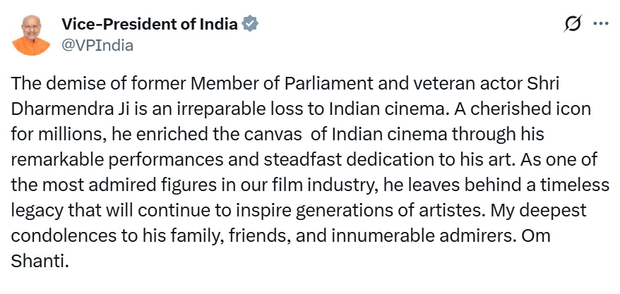 He wrote on X, "The demise of former Member of Parliament and veteran actor Shri Dharmendra Ji is an irreparable loss to Indian cinema. A cherished icon for millions, he enriched the canvas of Indian cinema through his remarkable performances and steadfast dedication to his art. As one of the most admired figures in our film industry, he leaves behind a timeless legacy that will continue to inspire generations of artistes. My deepest condolences to his family, friends, and innumerable admirers. Om Shanti."