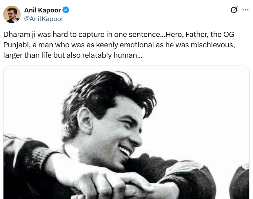 Remembering Dharmendra and his legacy, Anil Kapoor wrote on X, "Dharam ji was hard to capture in one sentence...Hero, Father, the OG Punjabi, a man who was as keenly emotional as he was mischievous, larger than life but also relatably human..."