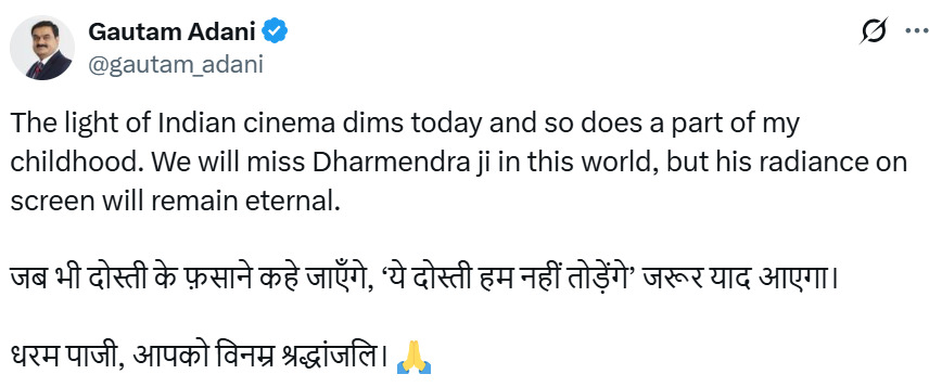 Gautam Adani wrote on X, "The light of Indian cinema dims today and so does a part of my childhood. We will miss Dharmendra ji in this world, but his radiance on screen will remain eternal. जब भी दोस्ती के फ़साने कहे जाएँगे, ‘ये दोस्ती हम नहीं तोड़ेंगे’ जरूर याद आएगा। धरम पाजी, आपको विनम्र श्रद्धांजलि।"