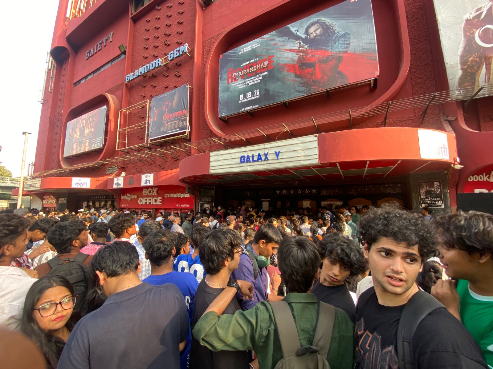 A huge crowd has gathered outside Gaiety Galaxy in Bandra as the shows are running late. The 4:45 pm screening has still not started. Delays are being reported everywhere because theatres must first download the film and then receive the KDM (Key Delivery Message), which grants permission to play it, leaving audiences waiting impatiently.