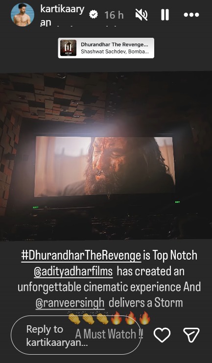 Kartik Aaryan took to Instagram and lauded Dhurandhar 2. He called the Ranveer Singh starrer "top notch." Take a look at his post below: