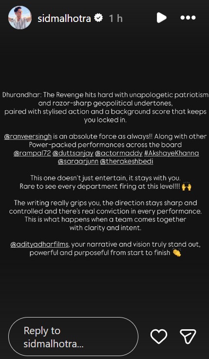 Taking to Instagram, Sidharth Malhotra shared a long note showering love on Dhurandhar 2, which starred Ranveer Singh in the lead role. Take a look at Sidharth's post here: