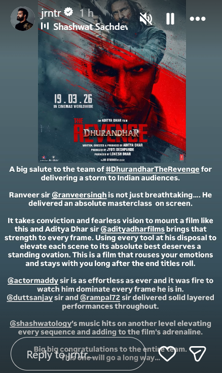 Jr NTR took to his Instagram handle to share his thoughts on Dhurandhar 2 today.