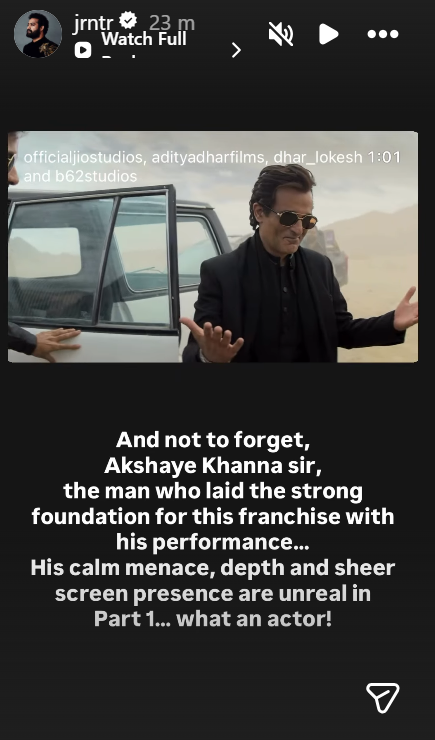 After sharing his thoughts on Dhurandhar 2, Jr NTR wrote in a separate post on his Instagram Stories, “And not to forget Akshaye Khanna sir, the man who laid the strong foundation for this franchise with his performance. His calm menace, depth, and sheer screen presence are unreal in Part 1. What an actor.”