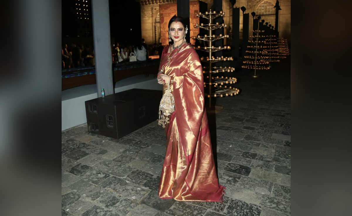 Attention please as the OG fashion queen Rekha is here. The veteran star arrived at Dior's pre-fall fashion show in one of her most beautiful saree, and we just can't take our eyes off her. Rekha opted for a red and golden saree with a golden handbag for the event. She styled her hair into a neat bun with gajara and sported statement jewellery. Rekha looked evergreen as ever and happily posed for the shutterbugs in style. Check out the pictures below: