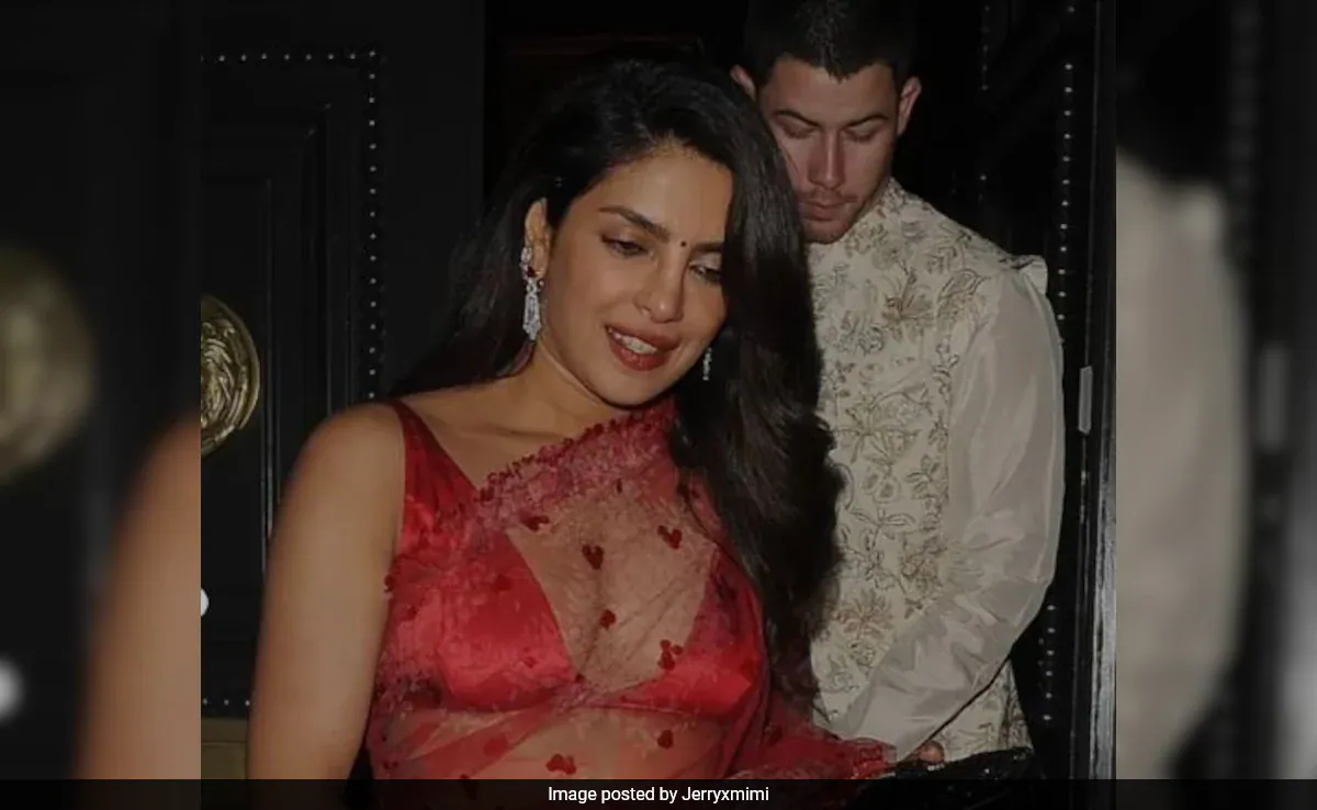 Priyanka Chopra and Nick Jonas hosted a Diwali dinner at Gymkhana restaurant in London recently. Glen Powell, Jack Reynor and Rebecca Corbin-Murray were amongst the guests. Pictures of the power couple were shared by a fan page dedicated to Priyanka Chopra on Instagram. For the occasion, Priyanka chose a red sheer saree, teaming it up with a blouse with a plunging neckline. She accessorized her festive look with a red bindi and bangles. Complementing her, Nick Jonas opted for a cream-coloured kurta suit. The couple can be seen exiting an eatery and smiling for the shutterbugs. Take a look at the pictures here: