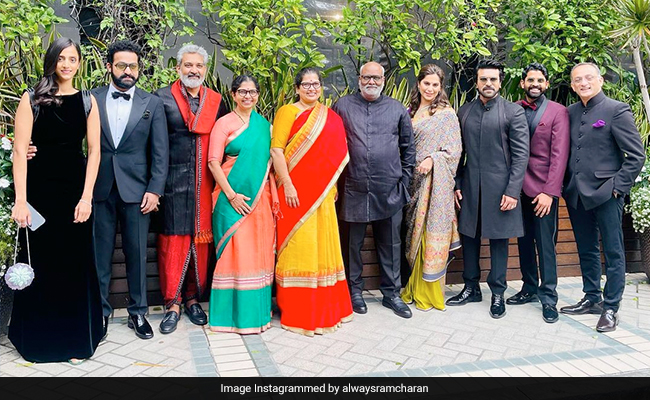 Before creating history by winning a Golden Globe for Best Original Song, the RRR Team Ram Charan, Jr NTR and director SS Rajamouli arrived in style on the Golden Globe Awards red carpet. Ram Charan treated his Insta family to a happy picture from Los Angeles in which we can see Jr NTR looking dapper in a black tux, while SS Rajamouli and Ram Charan can be seen in black traditional ensembles. The image also features their better halves Lakshmi Pranathi (Jr NTR wife), Upasana Kamineni (Ram's wife) and Rama Rajamouli (SS Rajamouli's wife). Sharing the photo, the actor captioned it as "THE #RRR FAMILY! On the way to the GOLDEN GLOBES."