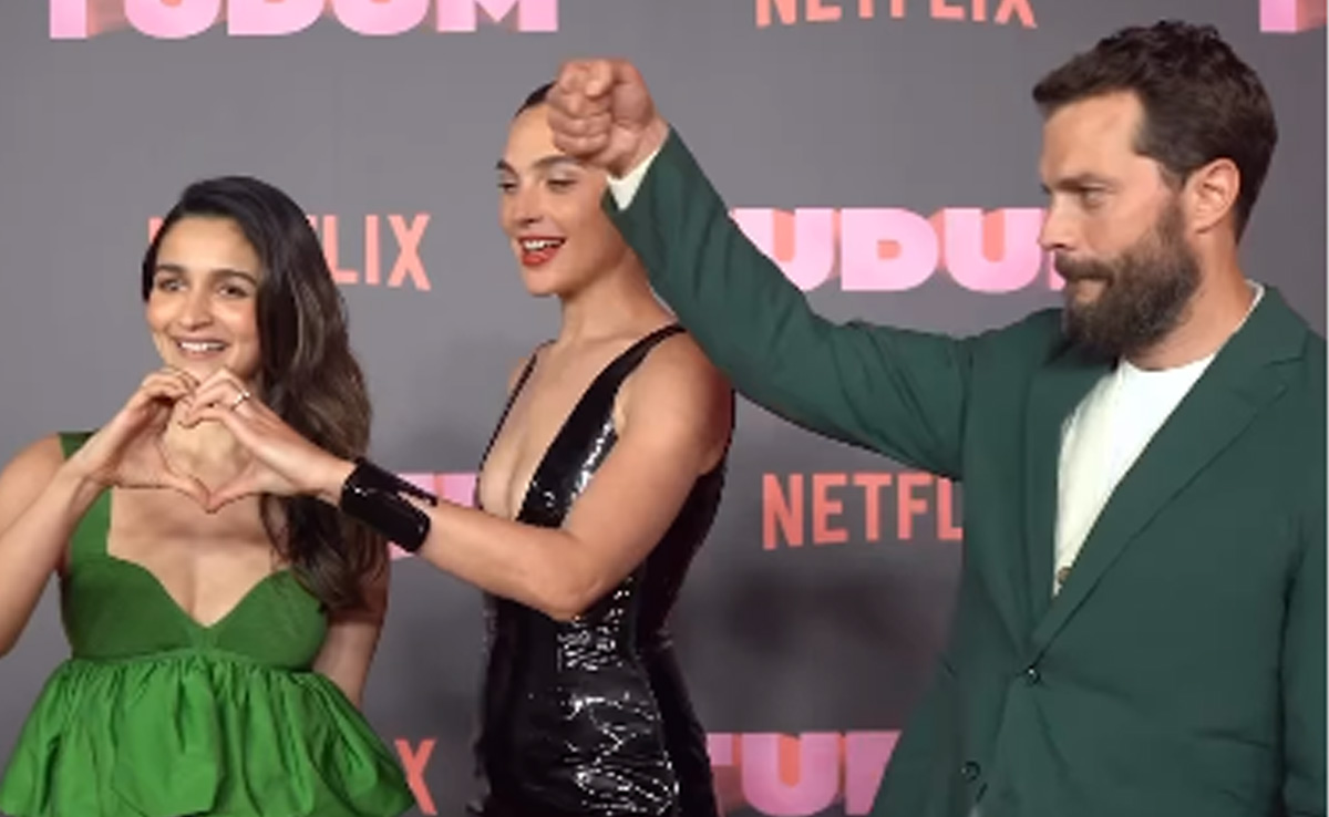 Fans can be heard cheering for the trio at the event. While relishing a bowl of her snack in her makeup chair, Alia Bhatt shared that it was time for the main Tudum event. The actress changed into a gorgeous peplum-style green gown. She was accompanied by Gal, decked up in a black leather dress, and Jamie, who looked dapper in a bottle green pantsuit.