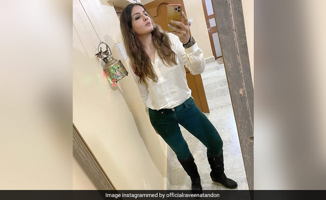 Actress Raveena Tandon is spending a relaxing holiday in nature's lap and as per her "it's such bliss to be cut off" and to connect to nature. For those who don't know, the 46-year-old actress is currently holidaying in Madhya Pradesh's Bandhavgarh Tiger Reserve. Raveena's vacation buddy is her daughter Rasha. On Wednesday, Raveena dropped a bunch of new pictures from her holiday but this time they are from the actress' hotel room and not the jungle. In the mirror selfies that Raveena shared on Instagram, she can be seen all dressed for what looks like a work-related virtual meet. She can be seen dressed in a white shirt and blue jeans. Raveena Tandon completed her look with black boots.
