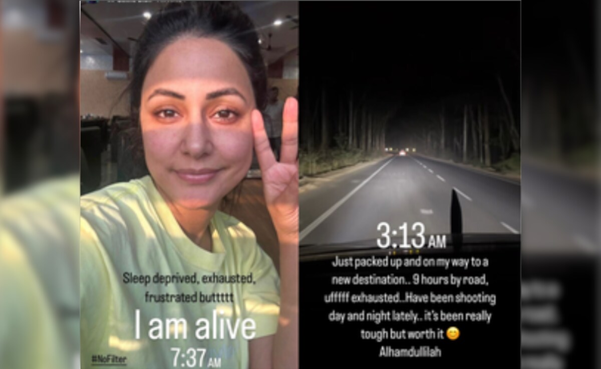 Actress Hina Khan has shared that she is sleep-deprived and exhausted due to work but asserts that she is still "alive." Hina took to Instagram and shared that she had to travel a nine-hour road trip to a new destination. "Just packed up and on my way to a new destination by road, nine hours by road. uff exhausted... Have been shooting day and night lately... It's been really tough but worth it," Hina wrote alongside a time stamp of 3.13 a.m.