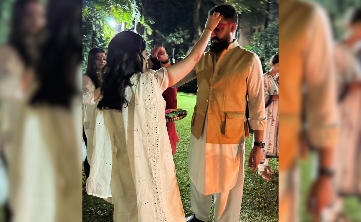 A day before the festival of colors, the Bachchans and the Nandas came together to celebrate holika dahan. In several pictures shared by Amitabh Bachchan's granddaughter Navya Naveli Nanda and her uncle Abhishek, the Bachchan family including Aishwarya Rai can be spotted celebrating the festival in the lawn of their Mumbai home. The photo album features Navya posing with the bonfire while the Ghoomer star can be seen closely monitoring the fire burning. In another photo we see Navya applying colors on the face of her uncle Abhishek Bachchan. Navya captioned the post as, "Holika Dahan."