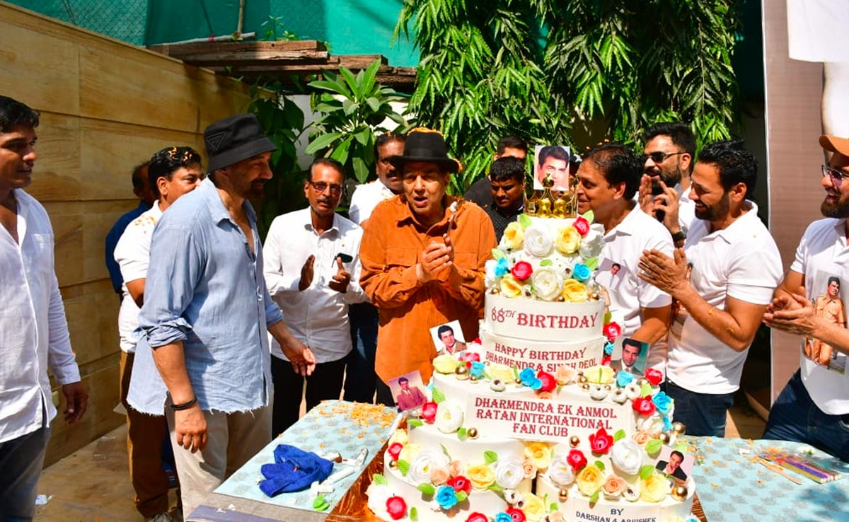 Film veteran Dharmendra, who celebrates his 88th birthday today, cut a birthday cake with fans and media outside his house. He was joined by eldest son Sunny Deol at the celebrations. Dharmendra wore an orange-coloured shirt and a black hat for the occasion. Sunny Deol was also dressed in his casual best. Dharmendra greeted the paparazzi with folded hands. In one picture, the evergreen star can be seen cutting the cake. In another, Sunny can be seen feeding his father a piece of cake. Dharmendra and Sunny Deol can be seen smiling widely for the cameras. Take a look at the pictures: