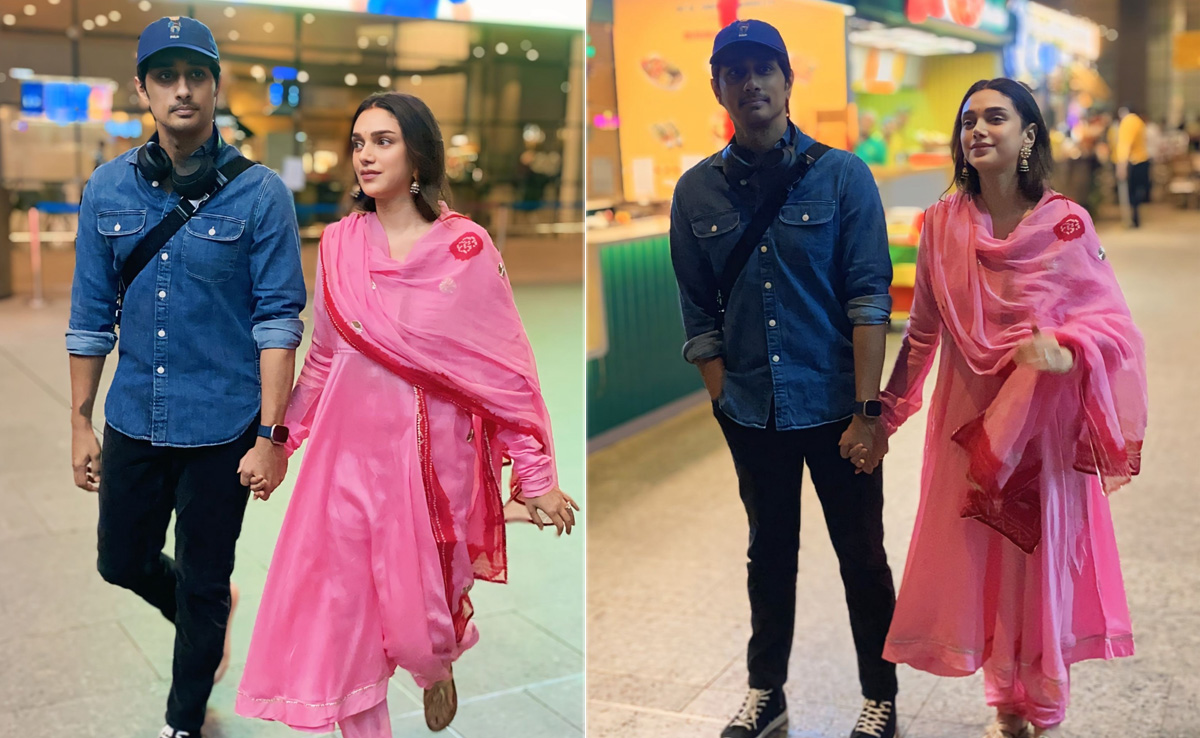Newlyweds Aditi Rao Hydari and Siddharth made their first public appearance together after their hush-hush wedding earlier this week. The couple were pictured at the airport. Aditi wore a pink salwar suit while Siddharth was dressed in blue. The couple were pictured holding hands. They posed for the shutterbugs. The paparazzi congratulated them at the airport. A paparazzo can be heard saying, "Mithai nehi laye hamare liye (Haven't you brought sweets for us)?" Aditi replies, "Kal (Tomorrow I will bring)." Take a look at the pictures here: