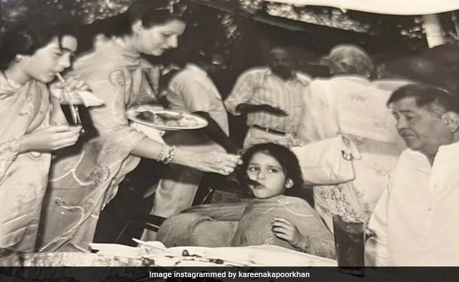 Kareena Kapoor's Instagram timeline is one fun place. The actress shares a lovely mix of professional and personal moments on her social media handle, much to the delight of her fans. Now, Kareena Kapoor has begun the week by sharing a lovely throwback image with her grandfather, legendary actor-filmmaker Raj Kapoor, and mother Babita. But it is the Kapoor sisters who steal the show. In the photo, a young Karisma Kapoor is seen sipping on a soft drink, while Babita is feeding Kareena Kapoor biryani. In the caption, Kareena Kapoor wrote, “Lolo gets the soft drink... I get the biryani #MondayThrowback,” she also added heart and laughing emojis.