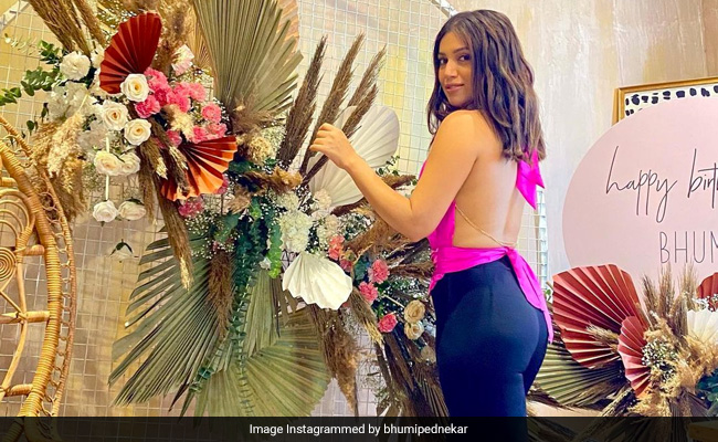 Bhumi Pednekar lit up Instagram on Sunday evening by sharing beautiful pictures and videos from her 32nd birthday bash. The actress celebrated her special day with her sister Samiksha Pednekar and a group of her friends on Sunday. "The official birthday photo dump 2021," she captioned her birthday album on Instagram. Going by Bhumi Pednekar's post, it appears she had multiple birthday celebrations. In one of the pictures, she looks stunning in a black top and jeans while in another photo, she can be seen posing against her birthday decorations in a backless pink halter top and black flared jeans. Another picture features the actress eating her birthday cake in a floral print dress.