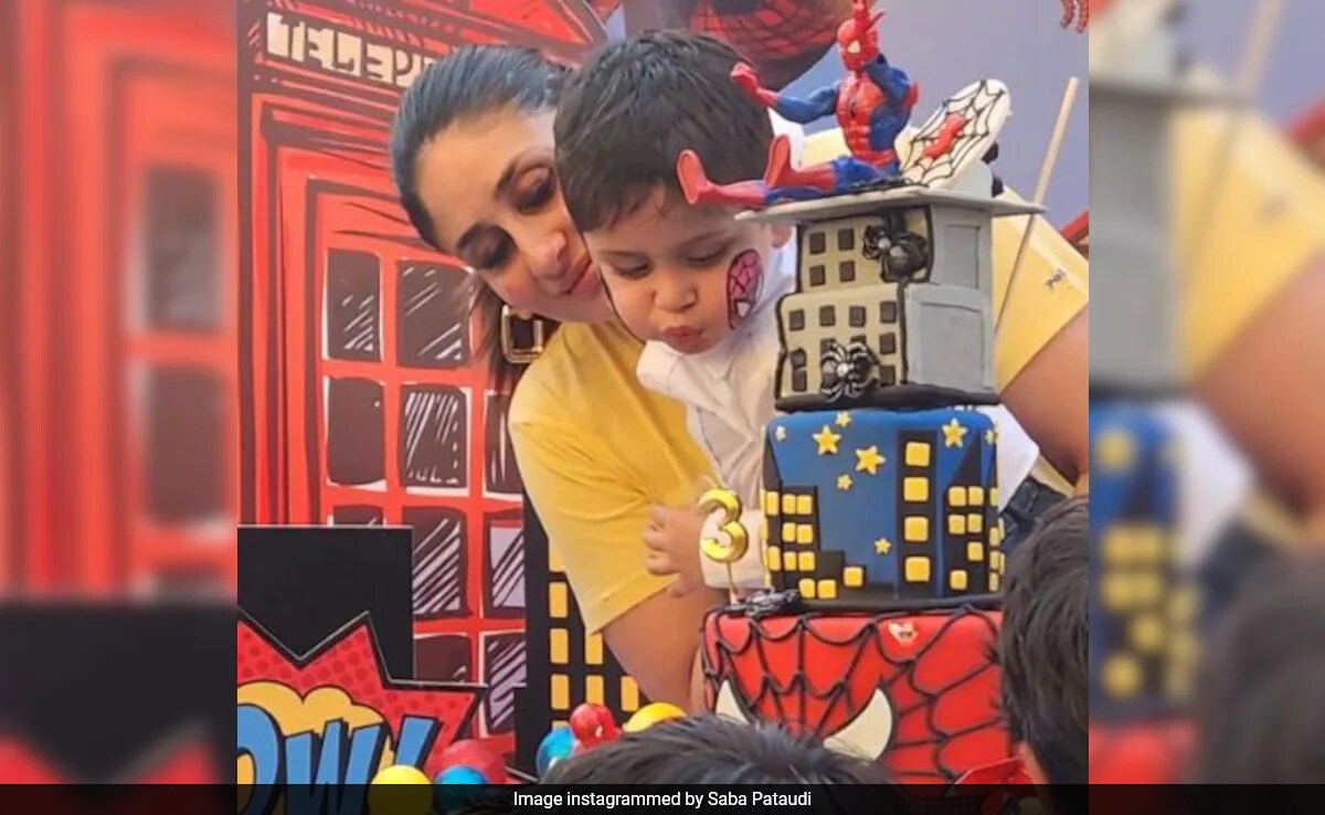 Saba Patuadi, aunt of Jeh Ali Khan, shared some inside pictures from his third birthday celebrations and they are absolutely aww-dorable. Kareena Kapoor and Saif Ali Khan hosted a birthday party on Wednesday evening. In the first picture, Saba Patuadi can be seen posing with sister-in-law Kareena Kapoor. While Saba wore a floral dress, Kareena kept her style statement casual. She wore a yellow t-shirt and paired it with Jeans. Don't miss the giant Spider-Man themed cake in the pictures. The other pictures feature Kareena-Saif, Babita, Soha Ali Khan with daughter Inaaya at the cake-cutting ceremony. Saba wrote in the caption, "Birthday Boy Bash! Mahsha'Allah..#jehjaan turns 3! Take a look: