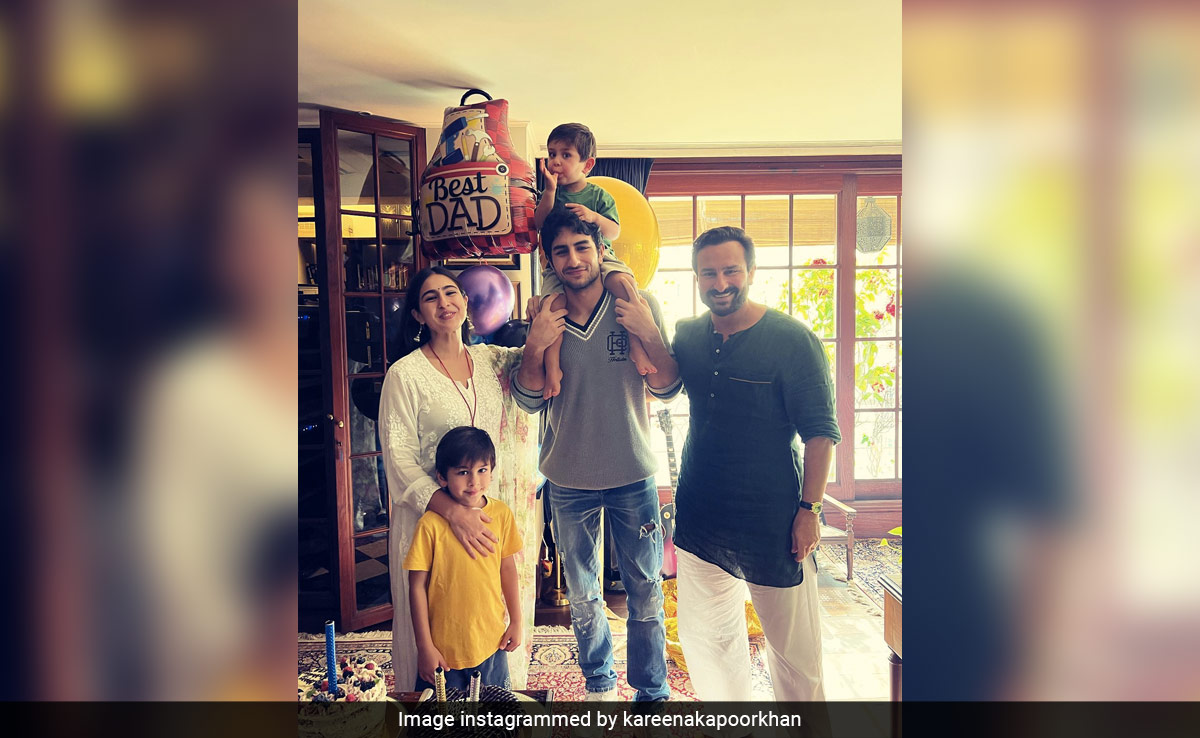 It was a family reunion of sorts at s Mumbai home today as Sara Ali Khan and her brother Ibrahim Ali Khan visited them, carrying balloons and other things to celebrate the Omkara star's 53rd birthday. As all four children of Saif Ali Khan came together for the cake-cutting ceremony, the happy frame was captured by none other than Kareena Kapoor. The actress also posted the image on her Instagram feed alongside a sweet caption. In the picture, we can see Saif and his kids flashing their widest smiles except for little Jeh, who, perched on top of his big brother Ibrahim's shoulder, is too busy chewing his thumb.