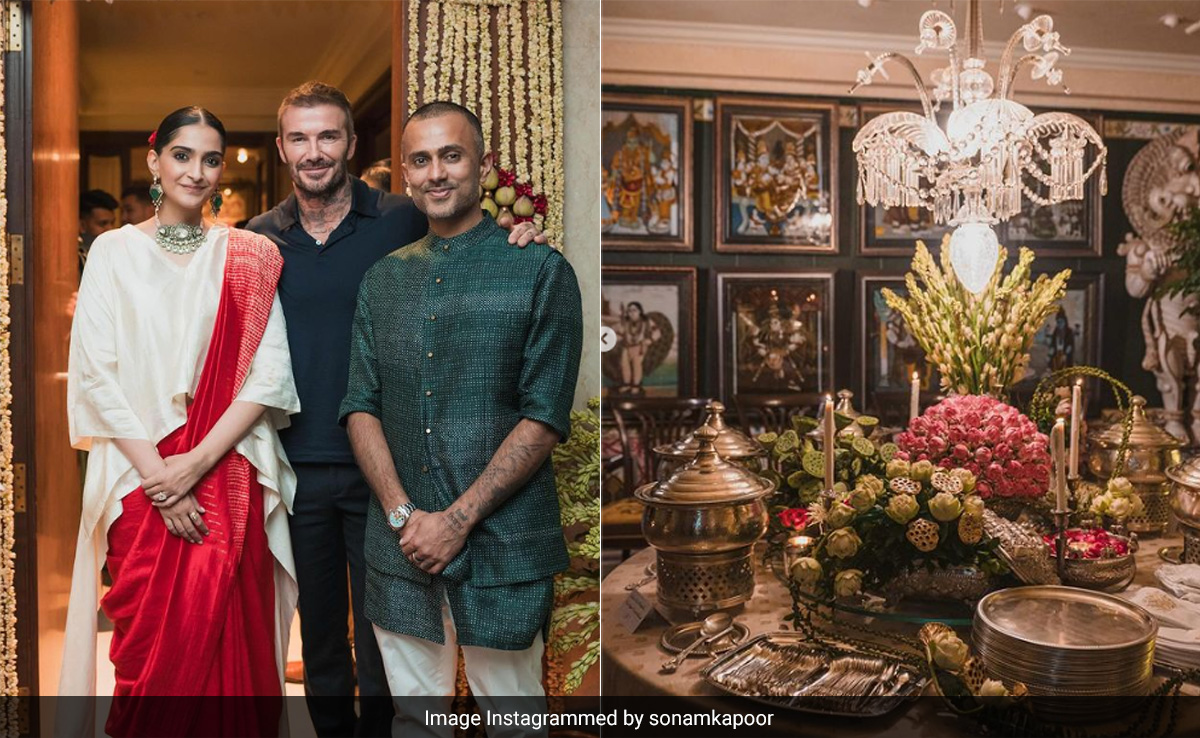 Sonam Kapoor and Anand Ahuja made it a point that their welcome party for David Beckham would be a talk of the town and the party did become so. A day after social media getting flooded with pictures of David Beckham with Bollywood celebs from the party, the host Sonam Kapoor shared some new pictures featuring the decor, dining table, artwork and, of course, the man of the moment David Beckham. In the carousel post, the first picture is a portrait of the guest and the hosts. In a couple of other pictures, David Beckham can be seen interacting with Anil Kapoor. A piece of garland can be seen tied to David Beckham's wrist.