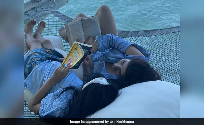 On Monday, Twinkle Khanna shared a post with daughter Nitara on her Instagram handle. Twinkle shared a picture from her vacation trip to the Maldives. Sharing the post, the actor wrote: "She swats me down with that tongue that could double up as an electric mosquito racket and always has more questions than I have answers. My only respite is to thrust a book in her hand so that her mind is occupied and her mouth is zipped up. Yet another reason to get them to read-A book a day keeps pesky kids at bay!" She also added hashtags like #Fing and #davidwalliams in her post.