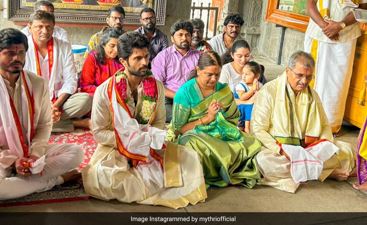 Vijay Deverakonda, whose recent release Kushi has been garnering praise from fans and critics alike, was recently spotted visiting the Yadadri Temple in Telangana with his family. In the pictures, Vijay can be seen offering prayers while being dressed in a vesti. The Arjun Reddy star's mom Madhavi, dad Govardhan Rao, and brother Anand were also pictured sitting alongside the actor. The pictures were shared on Mythri Movie Makers' official Instagram page alongside a caption that read, "The man of the hour, Vijay Deverakonda along with his family and team #Kushi took divine blessings at the Yadadri Temple after scoring a BLOCKBUSTER.”