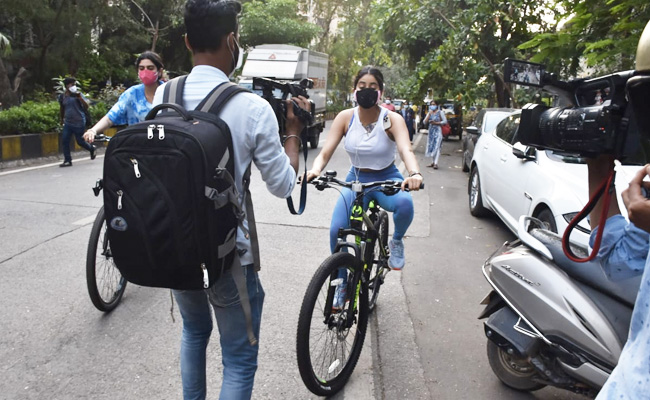 Janhvi Kapoor, who went cycling with her face mask on, did not pose for pictures, like she usually does. After requesting the paparazzi to move away, she got off the cycle and quickly made her way inside through the gates.
