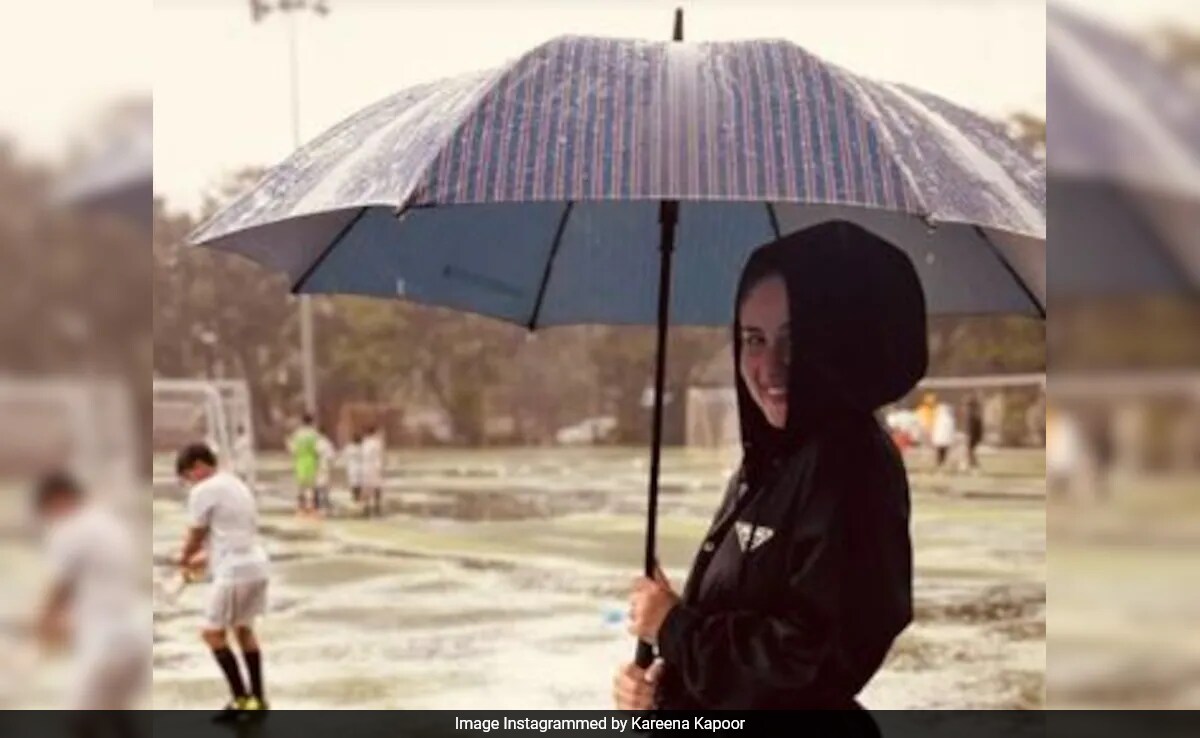 Kareena Kapoor is a hands-on mom to her kids Taimur and Jeh. On Saturday, the actress braved the Mumbai rains to cheer for her boys at their football match. She shared a couple of pictures from the venue on her Instagram Stories. The first frame captures Kareena standing near the football field while holding an umbrella. For her day out, the actress picked a black raincoat with matching trousers and a pair of gumboots. Her smile says the rest. “Soccer mom duty (red heart emoji),” she wrote.