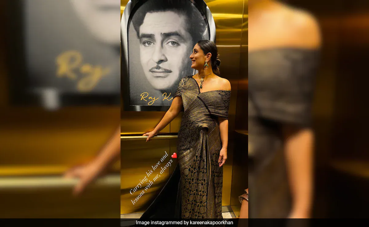 Kareena Kapoor recently completed her 25 years in the film industry. Honouring her contribution to cinema, PVR-Inox hosted the Kareena Kapoor Film Festival in Mumbai on Wednesday. The actress attended the event dressed in a modern Banarasi drape. At the event, Kareena posed for a photo with a black and white portrait of her grandfather, legendary filmmaker Raj Kapoor. Sharing the image on her Instagram stories, Kareena Kapoor wrote, “Carrying his love and lessons with me, always.”