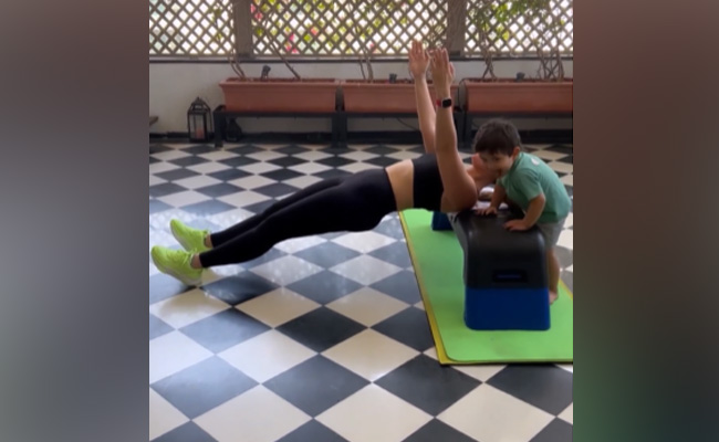 Kareena Kapoor has the best “workout buddy” – her little son Jeh. The Internet agrees. The actress, who often shares glimpses of her fitness routines, posted a similar clip on Wednesday. This time, she wasn't the one who grabbed all the attention of her fans. An adorable Jeh stole the show by making a short appearance in Kareena's workout video. He is seen wearing a green tee and grey shorts while trying to climb the aerobic stepper. Kareena Kapoor, who is busy maintaining balance on the bench in the video, tries to hold her son with one hand so that he doesn't fall. Giving her fans a sneak peek into her “mom life,” the actress wrote, “Working out with my best workout buddy (blushing, heart eye, biceps and red heart icons).” She also added the hashtags “mom life,” “midweek balance,” “The Crew” (her next film) and “workout” to her caption. Kareena's workout song, this time, was Guru Randhawa's Moon Rise.