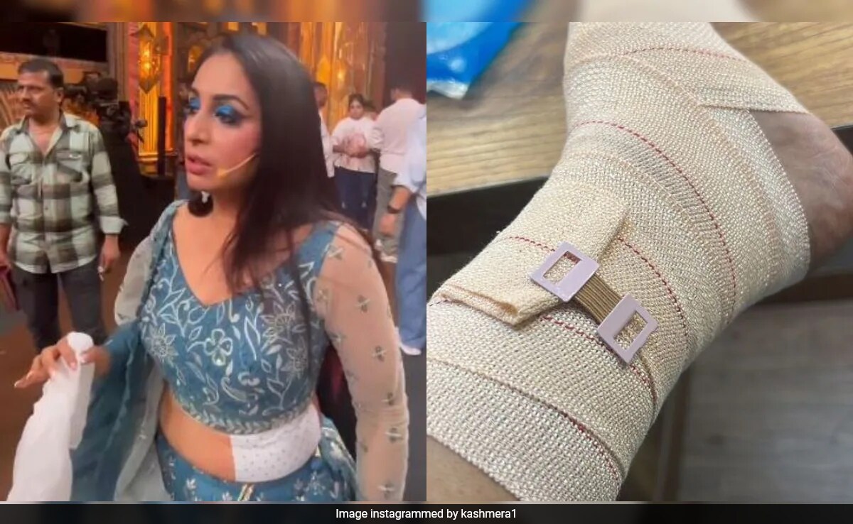 Kashmera Shah is currently busy shooting for the reality television show Laughter Chefs along with her actor-comedian husband, Krushna Abhishek. The actress recently suffered injuries after a fall on set in Mumbai. On Tuesday, Kashmera shared several photos on her Instagram handle and gave a closer glimpse of her injuries. One of the pictures feature her injured ankle. She also revealed that she had hurt her ribs and twisted her ankle. In her post, Kashmera wrote, "I mentioned today that I feel there's bad nazar everywhere and pray for my safety. I just had an accident on the set with a major fall. Hurt my rib and twisted my ankle, but the show must go on."