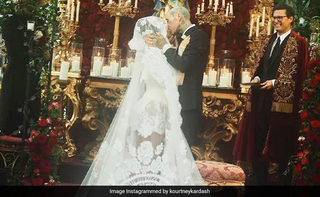 Later, Kourtney Kardashian shared another set of photos from the wedding. In these photos, Kourtney looks elated as she smiles at the camera and waves at her loved ones. In one image, we see Travis lovingly gaze at his bride while in another, he is standing facing the attendees at the wedding. The caption says, “Introducing Mr And Mrs Barker.”