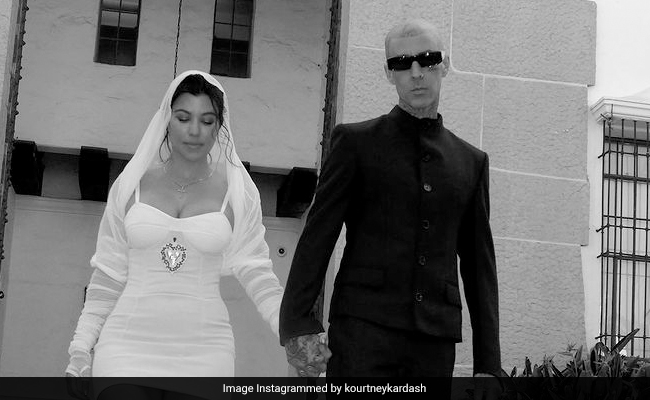 Kourtney Kardashian and Travis Barker had an intimate wedding in Santa Barbara, California, on Sunday and it looks straight out of a fairytale. How do we know this? Well, both Kourtney Kardashian and Travis Barker have treated fans to some stunning images from the ceremony. In the black-and-white photos, Kourtney and Travis are sharing tender moments in a convertible that was adorned with the “Just Married” sign and several cans. In the images, Kourtney Kardashian is in a mini white dress, stiletto heels, and a veil. Travis Barker, on the other hand, opted for an all-black look for the big day. Also seen in one of the images are Kourtney's grandmother, Mary Jo Campbell, and the Blink-182 drummer's father Randy Barker. In the caption, Kourtney Kardashian said, “Till death do us part.”