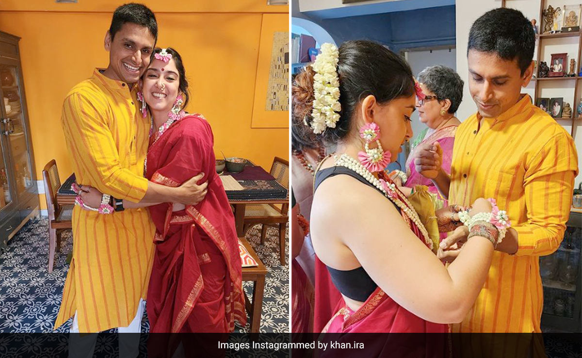 Ira Khan shared new photos from her pre-wedding festivities - her Kelvan ceremony to be precise. Ira picked a red saree for the occasion and and she accentuated it with floral jewelry, while Nupur Shikhare complemented her in a yellow kurta-pajama set. Ira captioned the post, "Kelvan 2! Ukhana 2! I love him so so much." In the comments section, Sanya Malhotra dropped heart emojis. Sara Tendulkar also dropped heart emojis. Rhea Chakraborty commented, "Cuties." Mithila Palkar added, "Cutus." Ira's cousin Zayn Marie wrote, "Omggg soooo cute you guyysss." In the comments section of the post, Nupur Shikhare wrote, "I love you, Nupur."