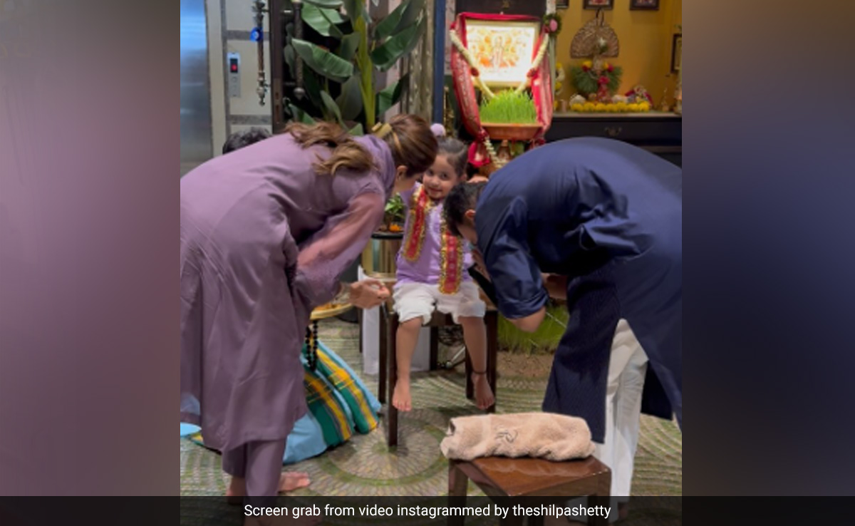 Shilpa Shetty and Raj Kundra performed Kanya Puja on the auspicious occasion of Durga Ashtami (eighth day of celebration). In the video, shared on Instagram, Shilpa and Raj are performing the kanya puja rituals with their three-year-old daughter Samisha. The clip opens to the couple washing little Samisha's feet. Next, Shilpa offers aarti and sweets to the little one. The eighth day is dedicated to Goddess Mahagauri. Sharing the video, the actress wrote, “On the auspicious occasion of Ashtami today, we performed the Kanya puja with our very own devi, Samisha. Our way of paying gratitude to the Supreme Goddess Mahagauri today and her nine divine forms.” Replying to the post, Shilpa Shetty's younger sister and actress Shamita Shetty wrote, “Lil munchkin (red heart emoticon).”