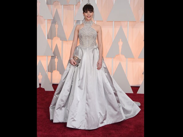 In a pale shade of silvery gray was best actress nominee Felicity Jones, who was resplendent in a hand-sewn, pearl-covered gown by Sarah Burton for Alexander McQueen, her shoulders bare.