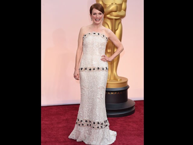 Julianne Moore, the favorite in the best actress category for playing a woman with early onset Alzheimer's disease in Still Alice, wore a custom beaded white strapless Chanel gown with black accents, her red hair swept back in a bun.
