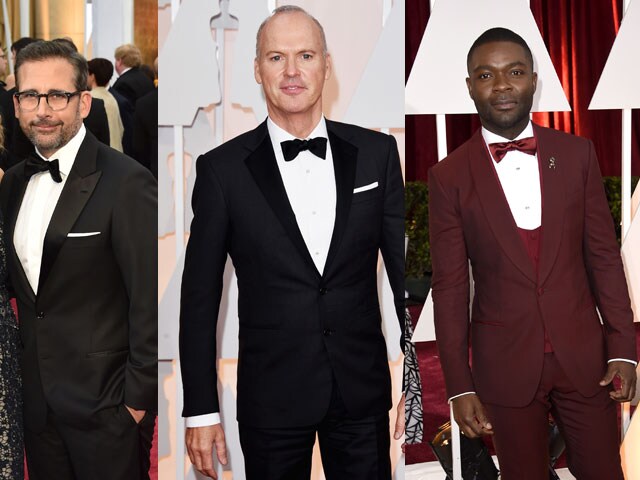 For the men, there were lots of classic black tuxedos -- best actor nominees Steve Carell and rival Michael Keaton, along with Boyhood star Ethan Hawke, a best supporting actor nominee, all kept it simple. But a few used the red carpet to get noticed, mixing it up with color. Selma star David Oyelowo -- who many observers felt deserved a nomination for playing Martin Luther King -- rocked a three-piece burgundy tux from Dolce & Gabbana.
