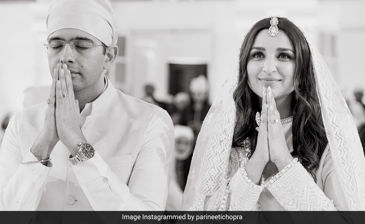 Parineeti Chopra has shared inside pictures from her engagement to AAP leader Raghav Chadha last weekend. The Shuddh Desi Romance actress posted a set of photos from the Sikh ardaas that took place in New Delhi's Kapurthala House on May 13. The pictures show the couple, dressed in white, being blessed by the head of the Akal Takht and listening to the shabads being sung. Parineeti captioned the post: "Felt surreal to be blessed by the Jathedar of the Akal Takht Sahib, Singh Sahib Giani Harpreet Singh Ji. His sacred presence at our engagement meant everything to us."