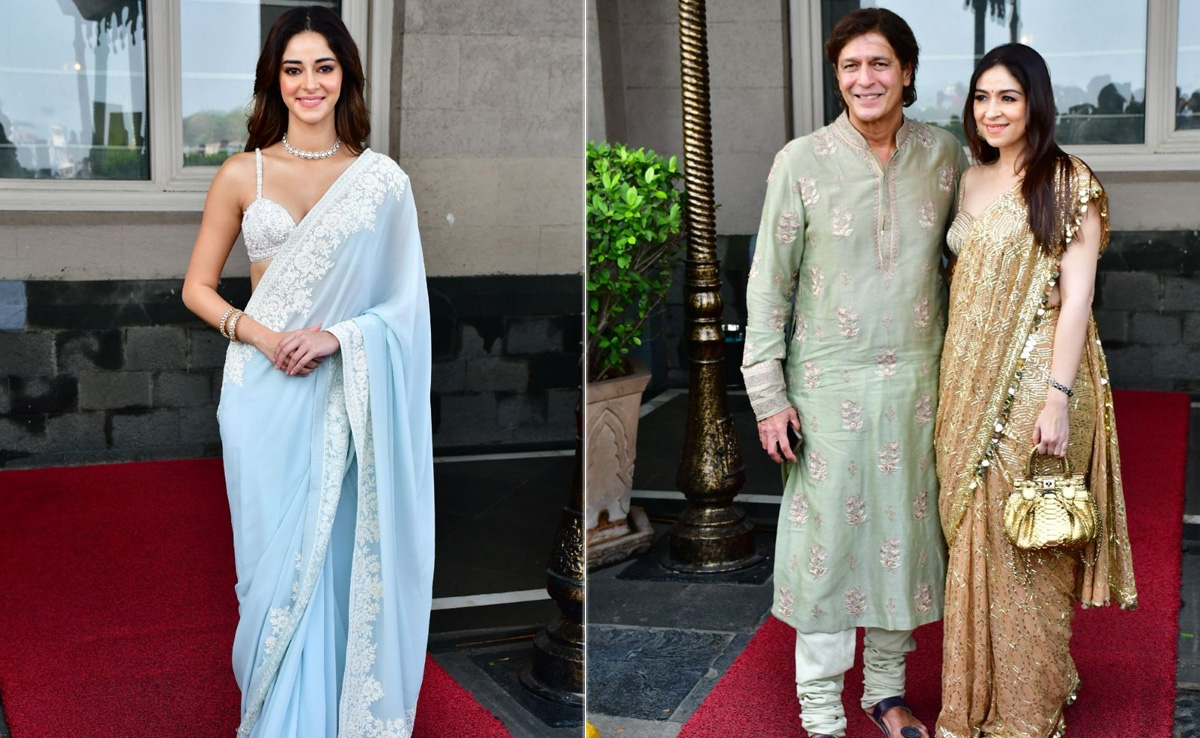 Make way for Ladki wale as the Panday family - Ananya, Chunky and Bhavana are here. Ananya's cousin Alanna is getting married to her fiance Ivor McCray (today), and the actress made sure to be the prettiest bridesmaid ever. The Liger star arrived at the venue in a pastel saree with embroidered border. She accessorised her look with a diamond neckpiece and bangles. She kept her hair loose and sported natural makeup. On the other hand, Chunky Panday looked handsome in a printed green kurta set, while Fabulous Lives Of Bollywood Wives star Bhavana Pandey dazzled in a bronze saree with embellishments. She added a golden chunky handbag to accentuate her look. Check out the pictures below: