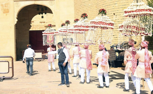 Finally, the moment that we are waiting for Kiara Advani and Sidharth Malhotra's wedding is here. The couple is set to marry today (February 7) in Jaisalmer, Rajasthan, and ahead of the wedding, we have brought you some pictures of baraat. In the images, some men can be seen in traditional pink outfits holding floral chhatris (umbrellas decorated with flowers). One of the men can be seen holding a flag that reads, "Delhi". Seeing the images, it seems pink is the colour of the wedding ceremony. They all are seen entering Suryagarh Palace (the wedding venue), while a woman can be seen assisting them.