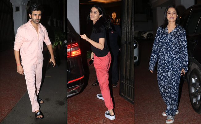 The theme for the party appeared to be casual and comfy. Shraddha Kapoor and Nushrratt Bharuccha, who were earlier clicked at an award show last night, switched to casual OOTDs for the party - Shraddha in a black t-shirt and pink pair of pants and Nushrratt in a printed co-ord set. Huma Qureshi and Patralekhaa also understood the memo. Kartik Aaryan's pick for the party was a pair of pink pants that he topped with a matching shirt.